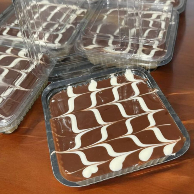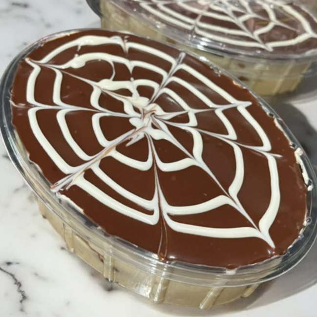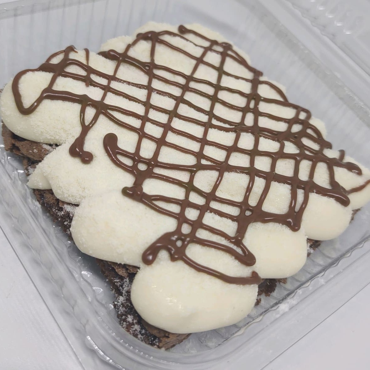 Brownie macio, coberto com creme de leite Ninho e finalizado com uma deliciosa calda de creme de avelã. Irresistível!