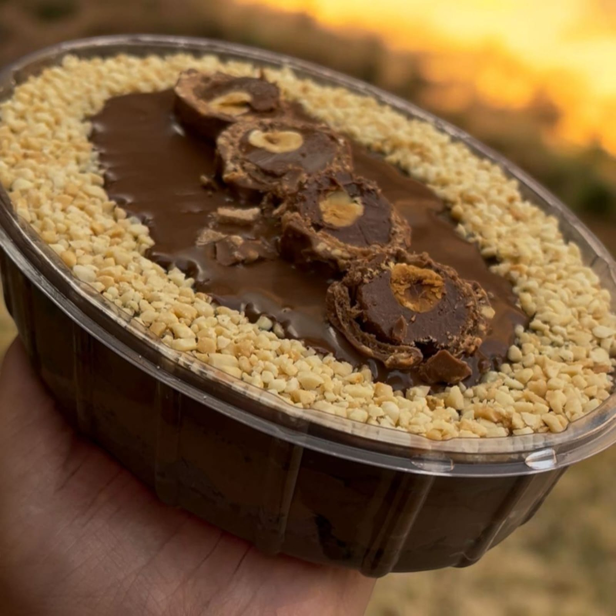 BRIGADEIRO TRADICIONAL, MASSA DE CHOCOLATE FOFINHA, MOUSSE DE CHOCOLATE, AMENDOIM CROCANTE E CREME DE AVELÃ, DECORATIVO BOMBOM FERRERO ROCHER. OBS: >>> TAMANHO P - PESO 600 G APROX.