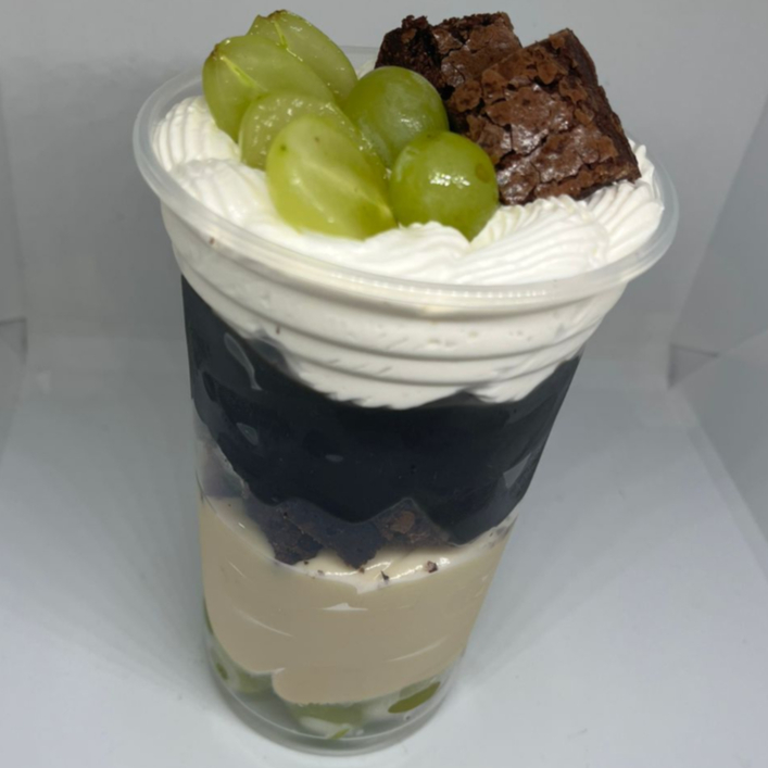 Uma combinação perfeita de uvas verdes frescas, brigadeiro branco, pedaços de brownie super macios, brigadeiro gourmet e mousse leve e cremoso. Cada camada foi pensada para conquistar seu paladar com muito sabor e carinho! Obs= mousse por cima será de acordo com disponibilidade em estoque, opções são: mousse de chocolate ou mousse de chocolate branco >>> Embalagem Copo 500ml. Serve 1 pessoa.