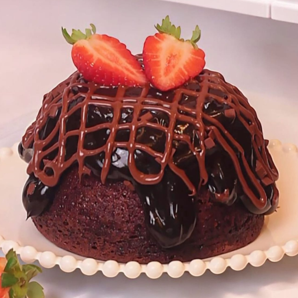 Massa de Chocolate fofinha, recheado no centro de Geleia de Morango artesanal, finalizado com cobertura de Brigadeiro artesanal cremoso e quentinho, fios de creme de avelã e Morango decorativo. Serve 1 pessoa; Tamanho 9cm.