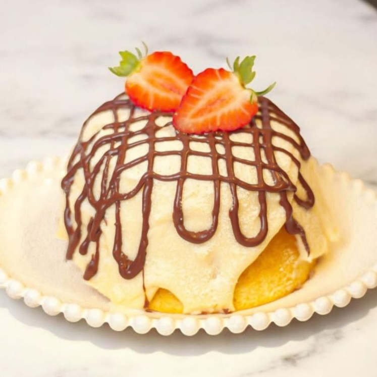 Massa branca, levemente doce e fofinha. Recheado no centro com Brigadeiro de Ninho, finalizado com calda de Brigadeiro de Ninho cremoso e quentinha por cima e para finalizar um toque de Creme de Avelã e Ninho puro e morango in-natura. Serve 1 pessoa, tamanho 9cm.