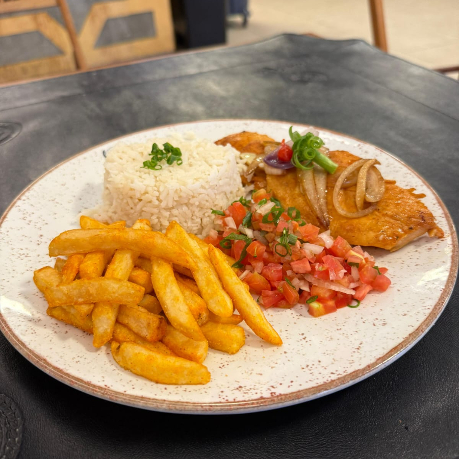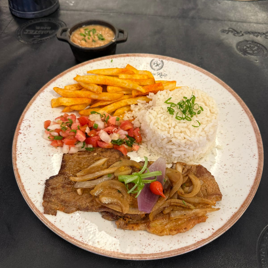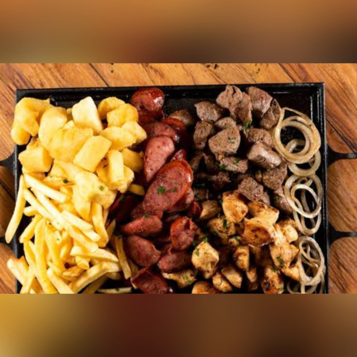 Nosso carro chef! 200g de filé mignon , 200g de filé de frango 150g de calabresa defumada , 150g de mandioca cozida com um toque de manteiga de sertão , pétalas de cebolas , pimentão vermelho ,tomate cereja , muçarela maçaricada 300g de batata frita , finalizada com pimenta biquinho e cheiro verde . Um prato extremamente saboroso.