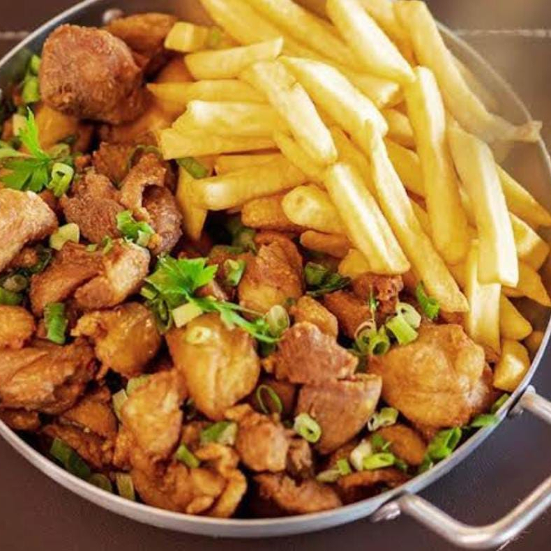 cortes de frango á passarinho ( aproximadamente 400g ) com alho frito granulado, pimenta biquinho e cheiro verde + 300g de batata frita + um molho artesanal a escolha.