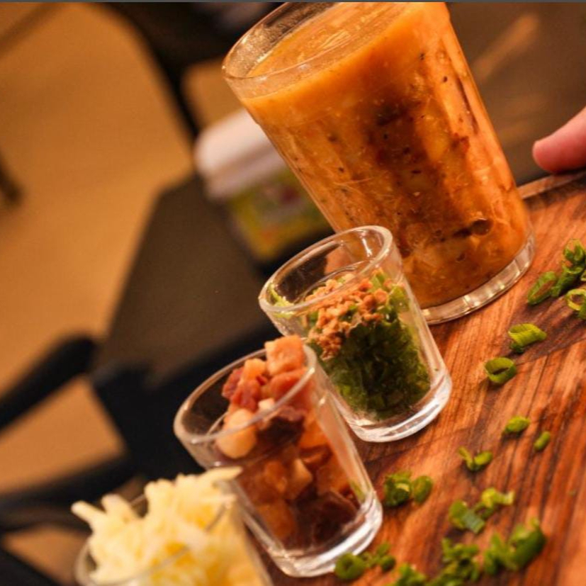 Delicioso caldo de dobradinha servido no copo americano grande . Acompanha torradas de baguete feita na casa muçarela , bacon e cebolinha .