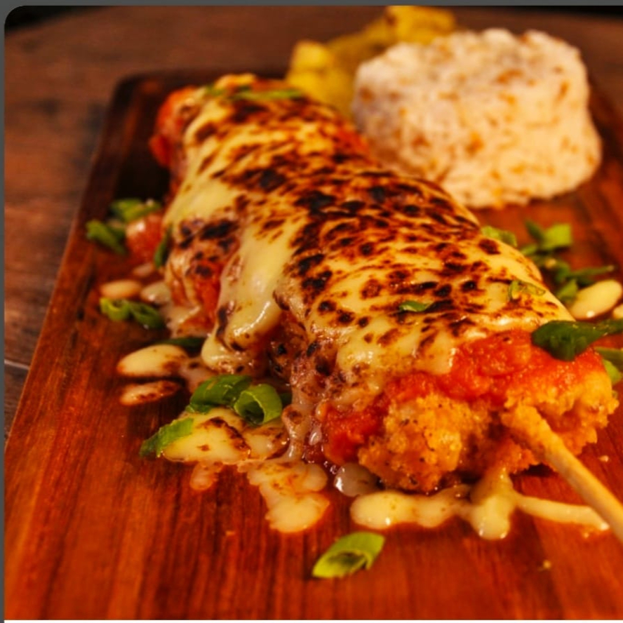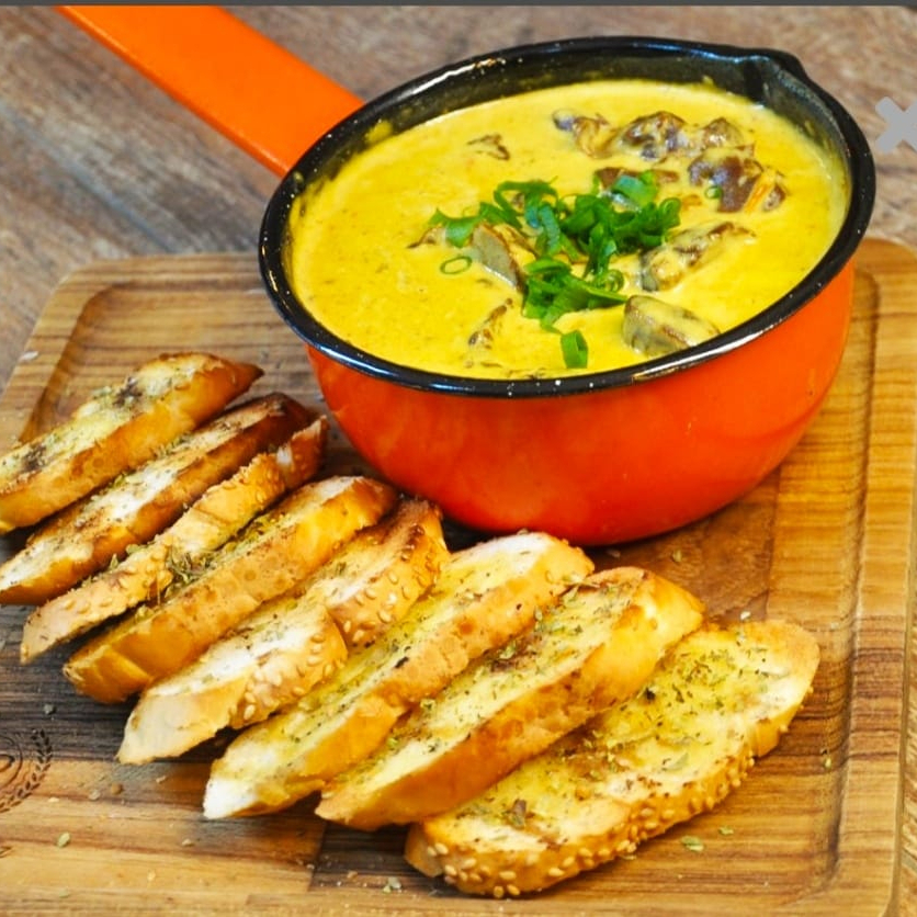 um suculento filé de frango ao molho de catupiry. Acompanha torradas de baguete feitas na casa .