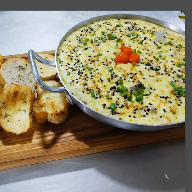 Uma entradinha perfeita delicioso creme de catupiry com filé mignon e muçarela gratinada para abrir seu apetite (prato individual)