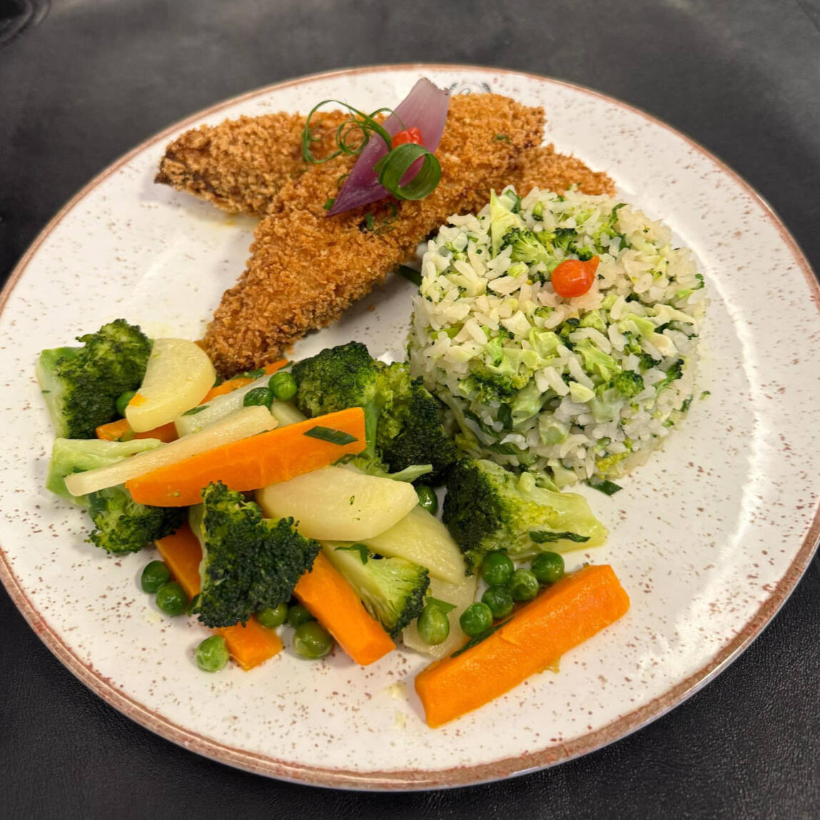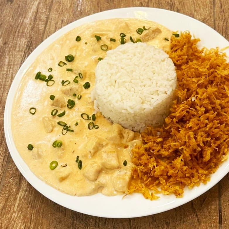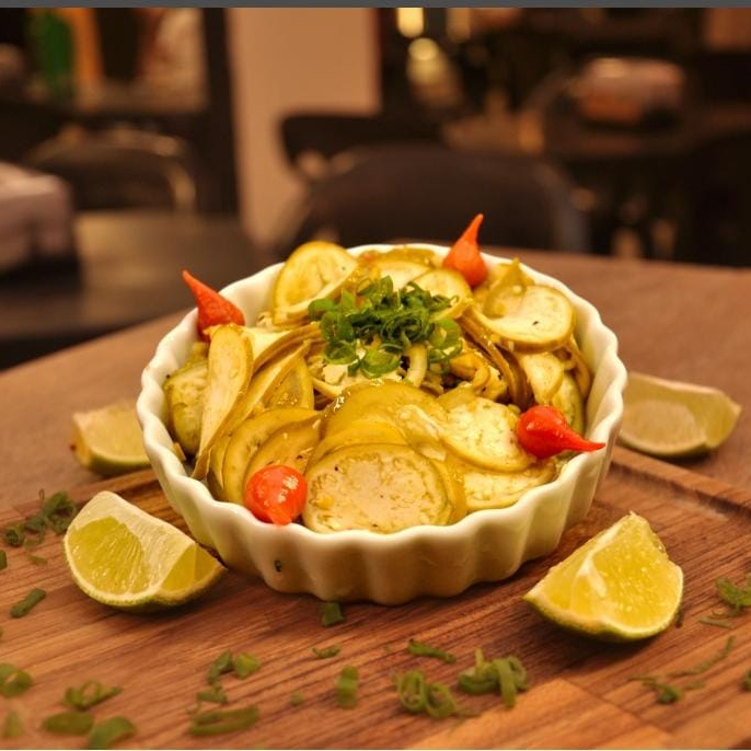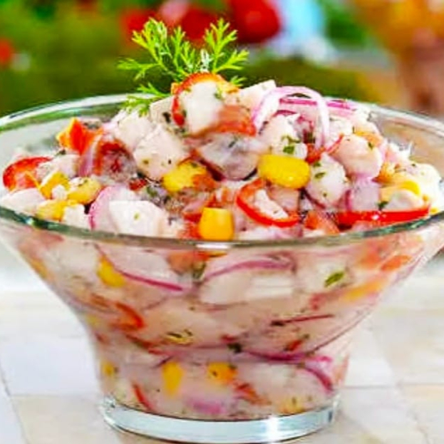 filé de tilápia saint peter em cubos com marianada citrica e temperos especiais . Um toque picante de pimenta dede de moça , cebola roxa em juliene e chios de batata doce.