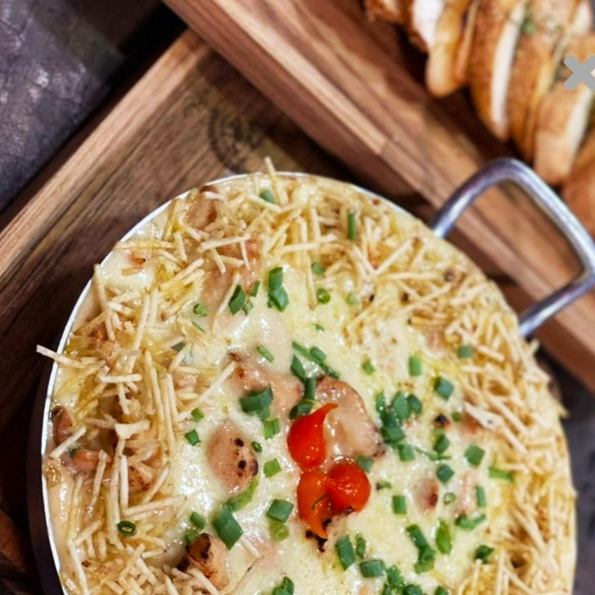 filé de frango ao molho de catupiry cremoso , muçarela maçaricada , amêndoas torradas+10 fatias de pão italiano gratinado.