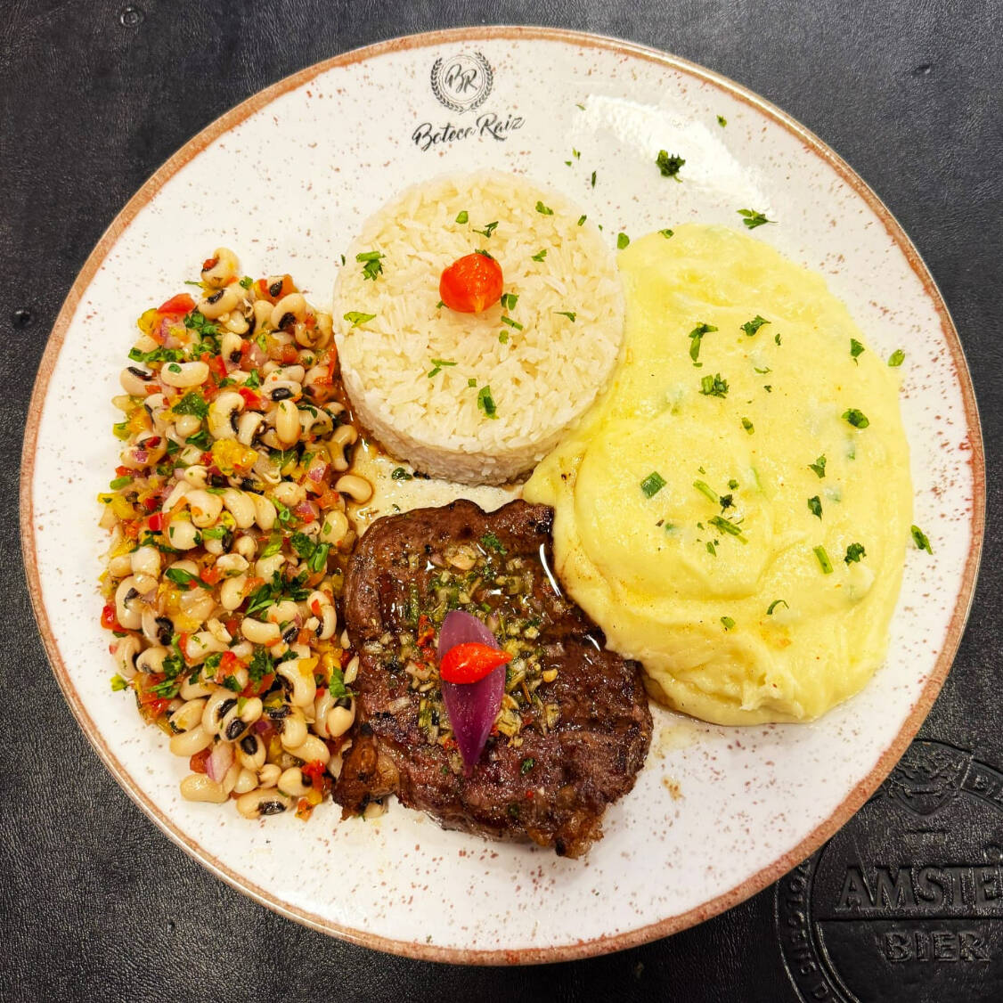 Arroz branco, feijão fradinho, purê de batata, vinagrete.