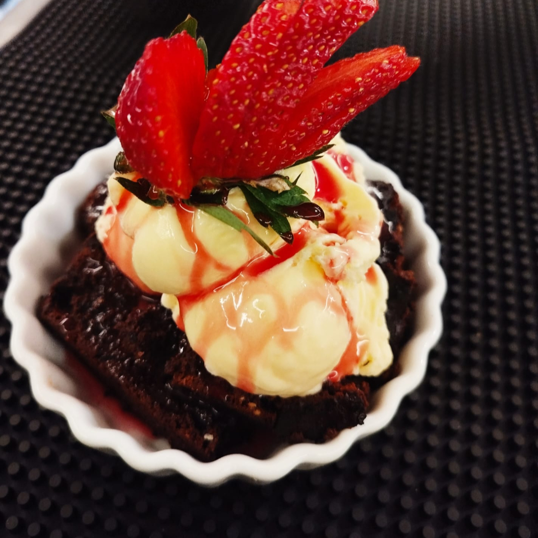 Um delicioso Brownie com uma leve casquinha crocante por fora, e surper macio e fofo , servido com uma saborosa bola de sorvete de creme , finalizado com cereja em calda .Uma ótima sobremesa.