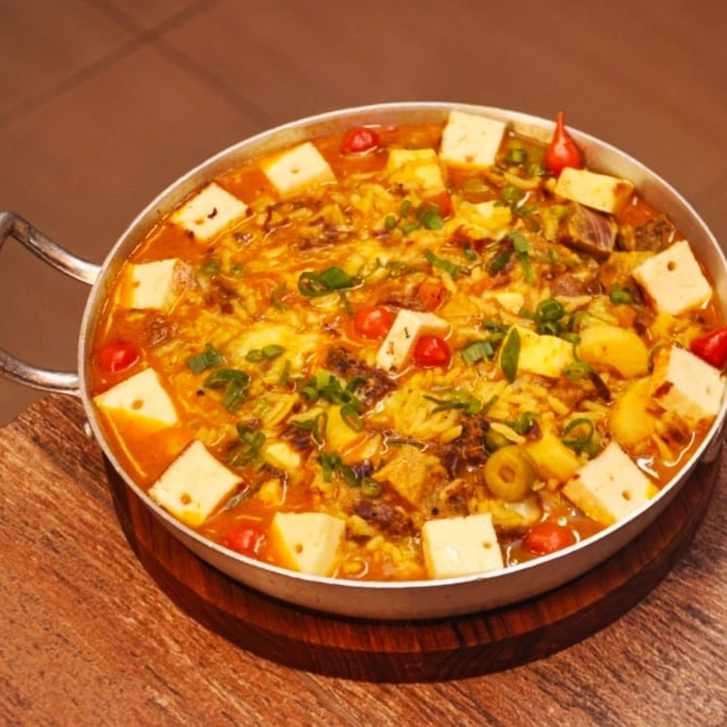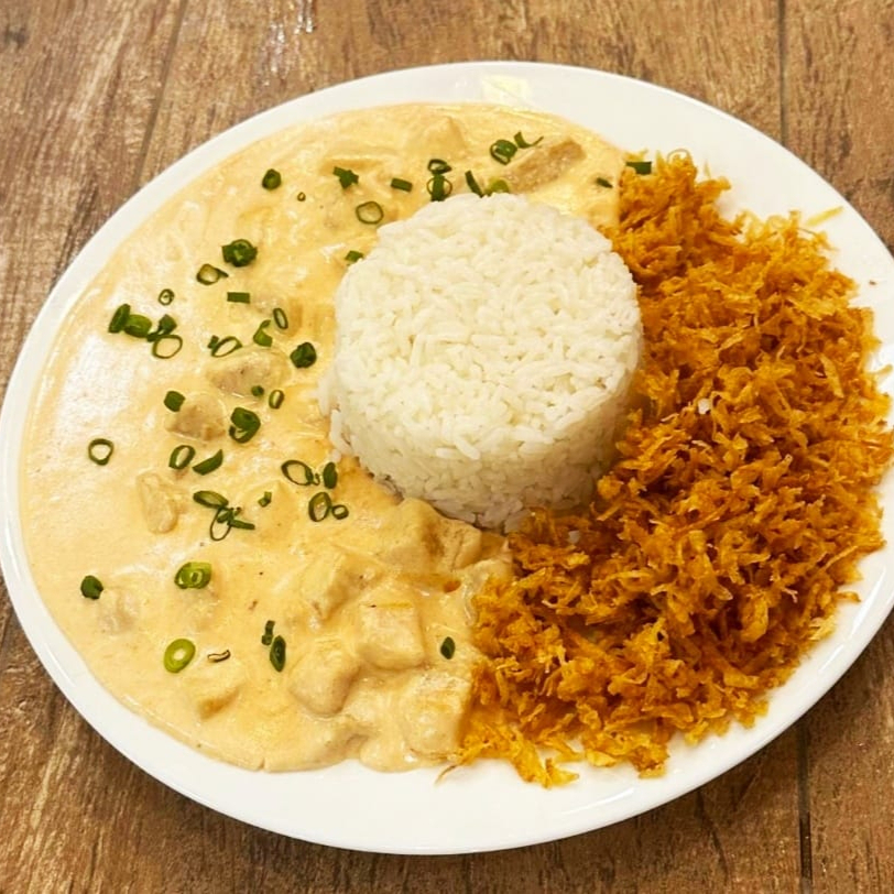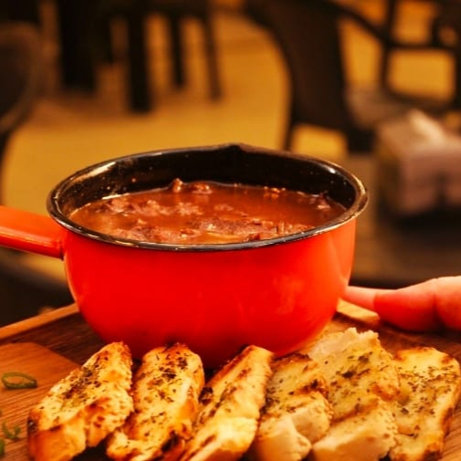 Uma deliciosa panelinha do sertão que acompanha arroz com carne de sol DES-MAN-CHAN-DO, tomate ,cebolas bacon ,calabresa ,finalizada com muçarela gratinada e cubos de queijo qualho
