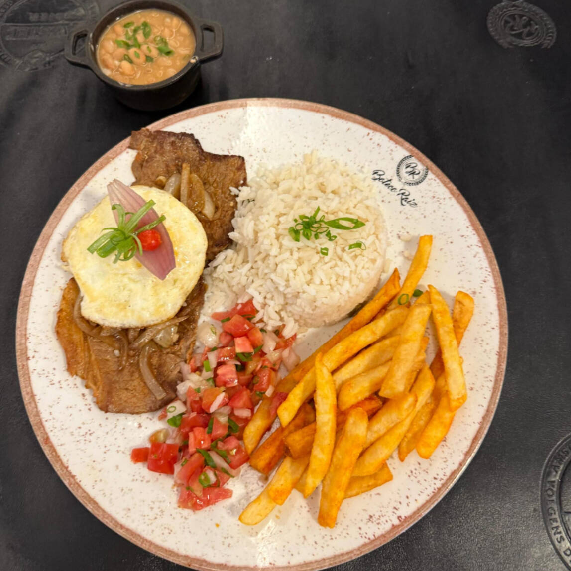 Arroz branco ,feijão de caldo , batata frita ,ovo frito e vinagrete.