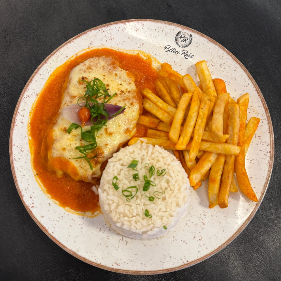Um delicioso esperto de contra filé empanado com molho de tomate feito na casa ,que acompanha mandioca soltada na manteiga com alho frito e arroz com alho. uma mistura deliciosa