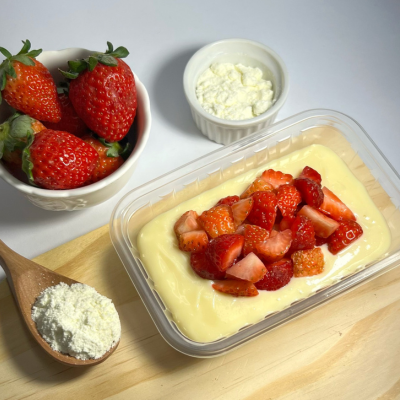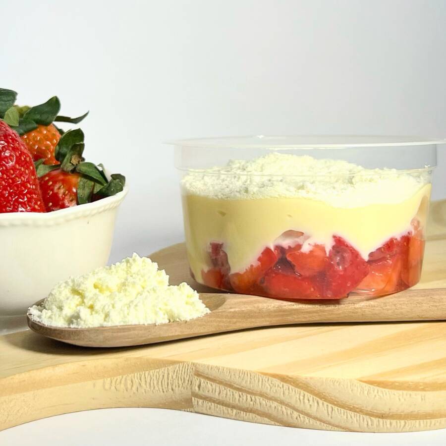 Um bolinho fofinho e dourado, recheado com morangos fresquinhos e suculentos, coberto com uma generosa camada de brigadeiro de leite ninho mega cremoso e irresistível. A combinação perfeita entre o doce suave do ninho e o azedinho do morango que derrete na boca. 300g