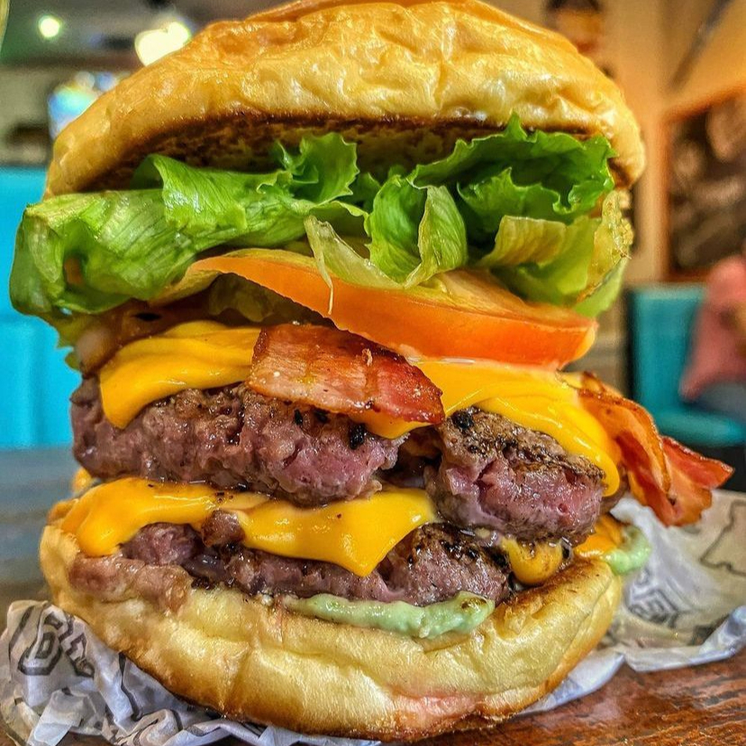 Pão, queijo cheddar, muçarela, hambúrguer 150g 2x, bacon, alface, tomate, abacaxi e molho da casa.
