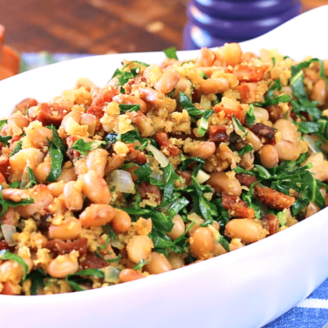 Feijão tropeiro com torresmo, mandioca e vinagrete.
