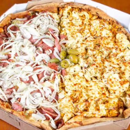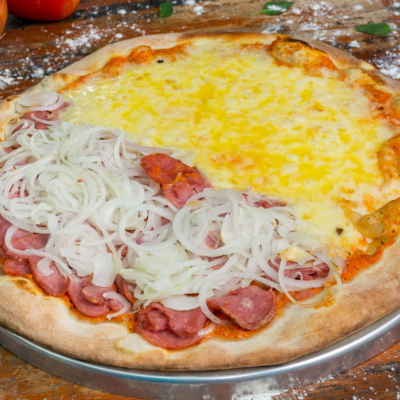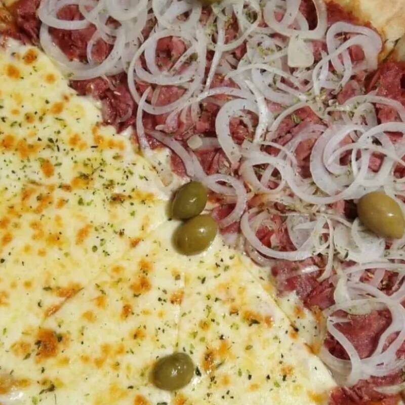 Metade calabresa suculenta e metade mussarela derretida, com cebola, azeitonas e molho de tomate.
