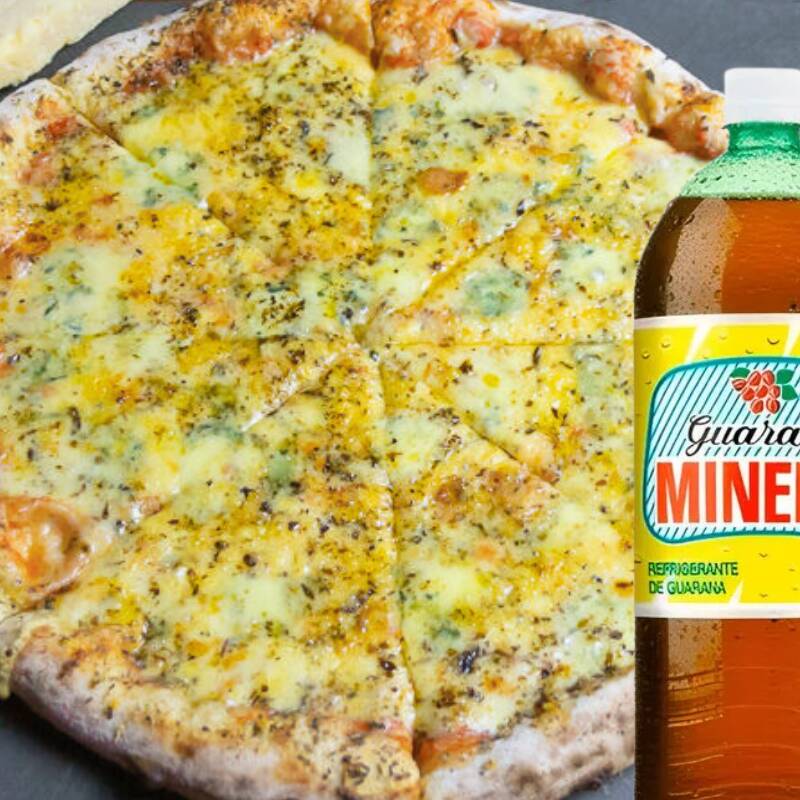 Aproveite 2 sabores incríveis em uma pizza grande de 10 fatias, acompanhada do tradicional Mineiro 1,5 litros.