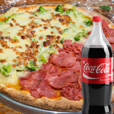 Escolha 2 sabores irresistíveis em uma pizza grande de 10 fatias e acompanhe com uma refrescante Coca-Cola 2 litros.