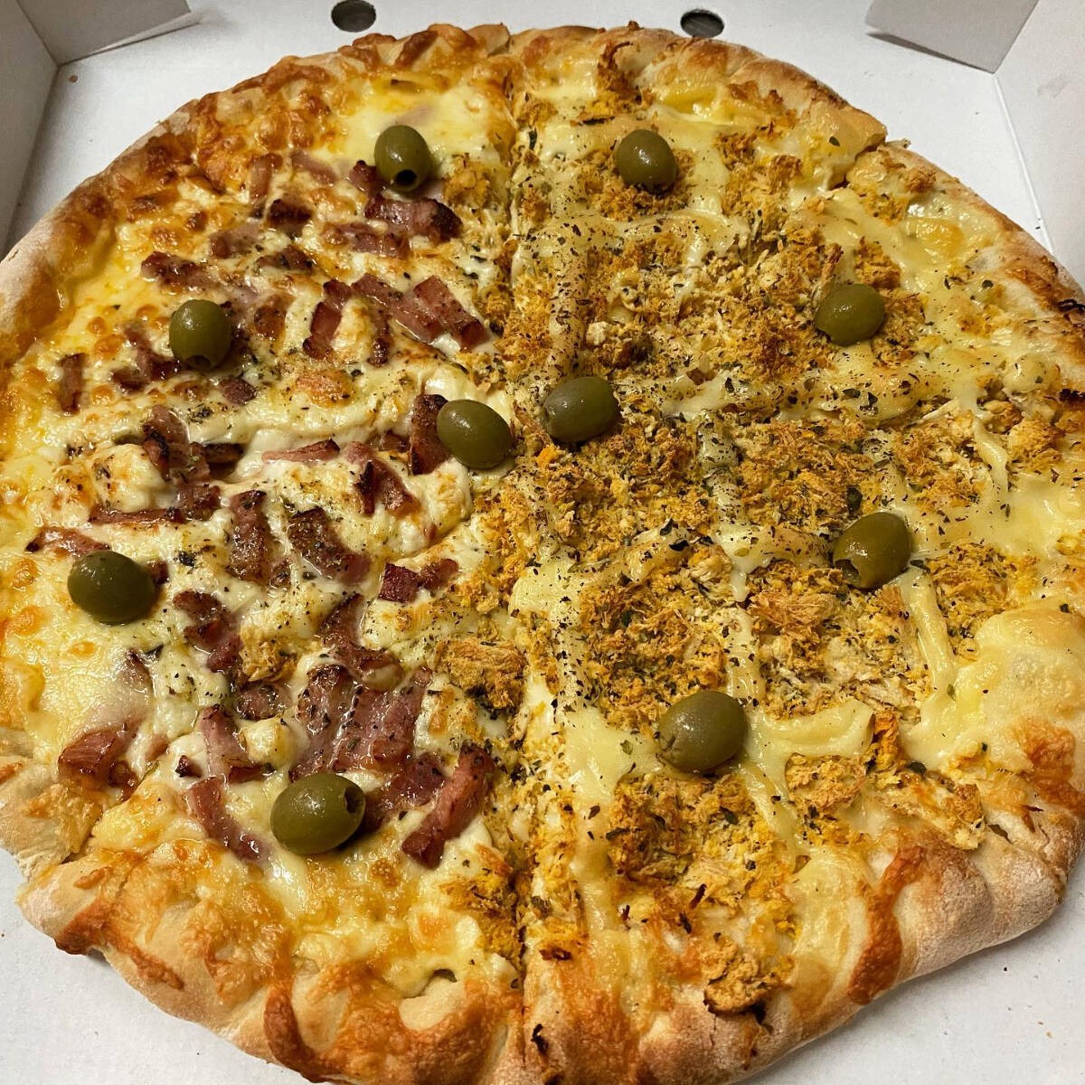 Metade com frango desfiado e Catupiry cremoso, e metade com bacon crocante, tomate, azeitonas e orégano, sobre uma base de mussarela e molho de tomate.