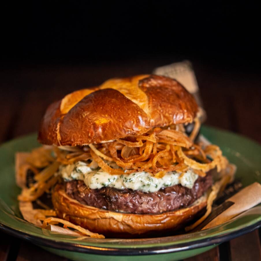 PÃO ESPECIAL SELADO NA MANTEIGA, BURGER BOVINO 160G, ANÉIS DE CEBOLA EMPANADOS, MUSSARELA DERRETIDA NO FOGO FORTE, BACON ARTESANAL,MAIONESE DEFUMADA DE ERVAS [FEITA NA CASA], TOMATE, GELEIA DE CEBOLA CARAMELIZADA [FEITA NA CASA]. "Isso de empanar cebolas é uma ideia brilhante! Combiná-las com hambúrguer, então, é feito nos levar para o céu dos melhores sabores, num cavalo alado!"