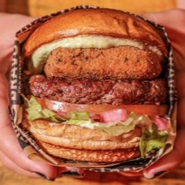 PÃO ESPECIAL SELADO NA MANTEIGA, BURGER BOVINO 160g, GENEROSO QUEIJO MUSSARELA EMPANADO, ALFACE, TOMATE, RELISH DE CEBOLA ROXA, MAIONESE DEFUMADA DE ERVAS [FEITA NA CASA]. "Todo imponente em sabor, textura, mas é leve na memória que deixa, do jeito que só os queijos conseguem."