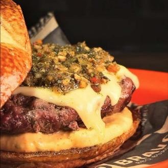 PÃO ESPECIAL SELADO NA MANTEIGA, BURGER BOVINO 160G, MOLHO BRAVURA [FEITO NA CASA, RELEITURA DO RANCH], QUEIJO EMMENTAL DERRETIDO EM FOGO FORTE, MOLHO CHIMICHURRI [FEITO NA CASA]. "O hambúrguer feito para agradecer o tempo e o movimento da vida. É singelo e gracioso."