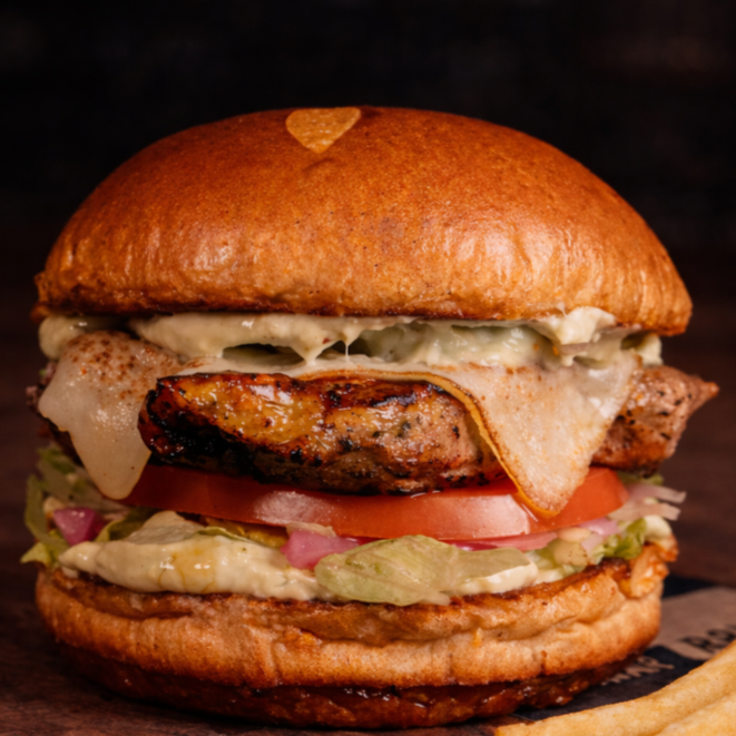 PÃO ESPECIAL SELADO NA MANTEIGA, SOBRECOXA DESOSSADA 140g (aprox.), MUSSARELA DERRETIDA NO FOGO FORTE, MAIONESE DEFUMADA DE ERVAS [FEITA NA CASA], ALFACE, TOMATE, RELISH DE CEBOLA ROXA. "A sobrecoxa desossada é a rainha das peças de frango, macia e suculenta. Este sanduiche é leve e viciante. "