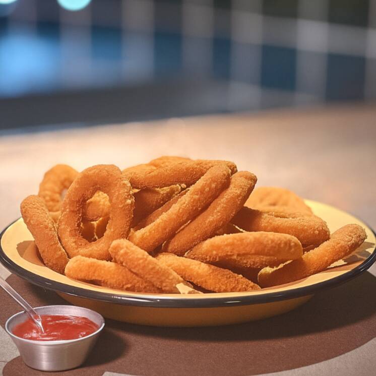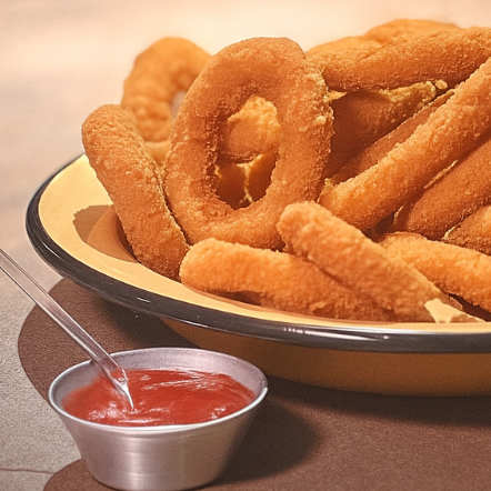 Cebolas empanadas em rodelas, sequinhas e cheias de sabor.