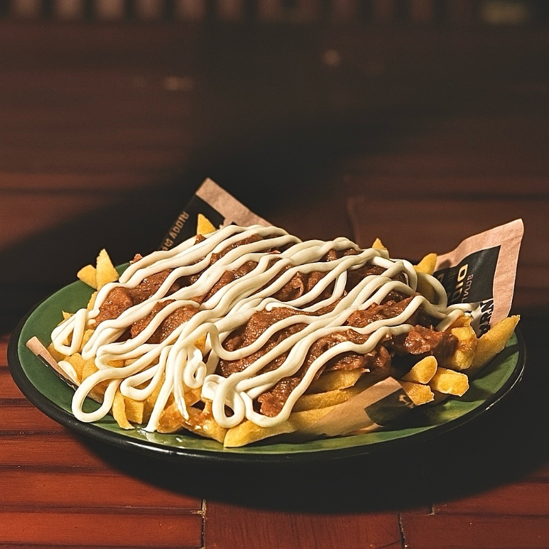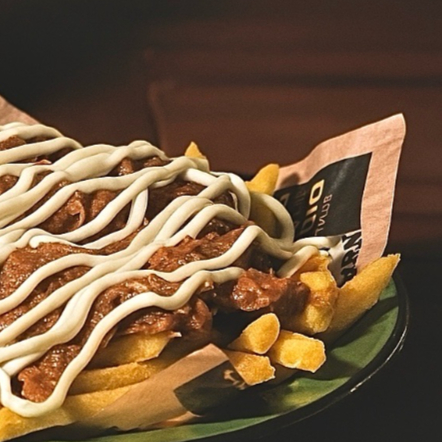 FRITAS COM PERNIL DE PORCO DESFIADO [FEITO NA CASA] BARBECUE ARTESANAL [FEITO NA CASA] E SOUR CREAM [FEITO NA CASA] "Um encontro de sabores que precisava acontecer. Feito com tempo e harmonia."