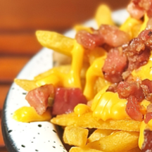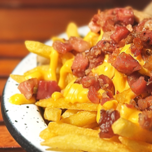 FRITAS COM CREME DE QUEIJO CHEDDAR [FEITO NA CASA] E BACON ARTESANAL PICADO. "Ninguém fica triste comendo a melhor e mais clássica combinação do mundo!"