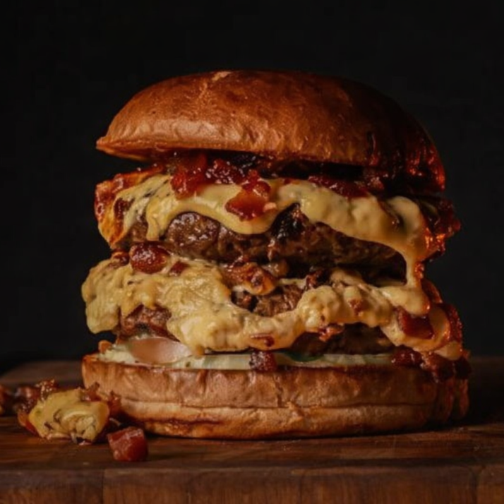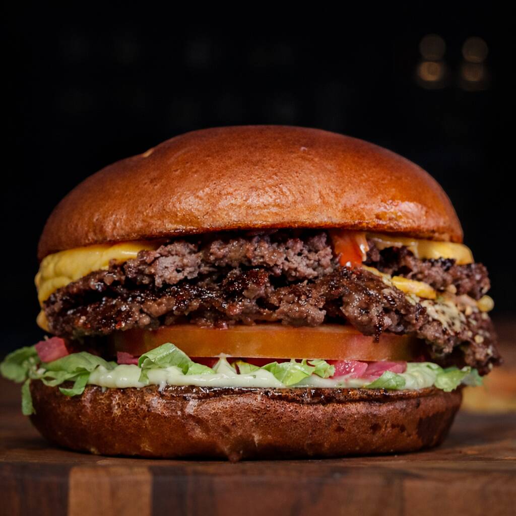 PÃO ESPECIAL SELADO NA MANTEIGA, 2 BURGERS BOVINO 160g CADA, DOBRO DE CREME CHEDDAR [FEITO NA CASA], DOBRO DE BACON ARTESANAL, DOBRO DE MAIONESE DEFUMADA DE ERVAS [FEITA NA CASA], TOMATE, DOBRO DE GELEIA DE CEBOLA CARAMELIZADA [FEITA NA CASA]. "Bom mesmo é muito, é o exagerado bem feito, em dobro, derramando! Se é por fome ou por gostar demais de hambúrguer, essa é a hora!"