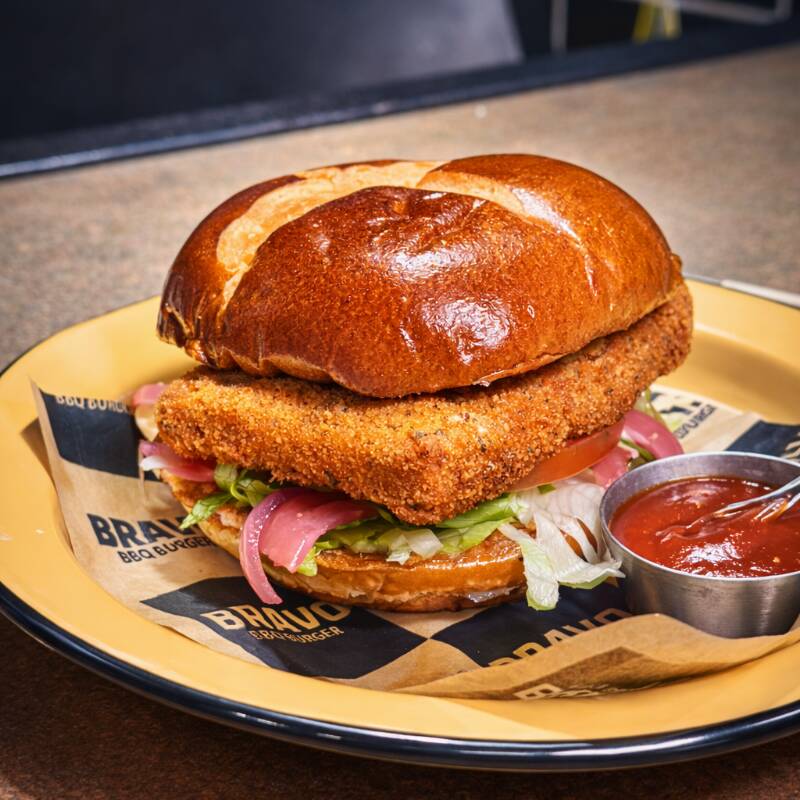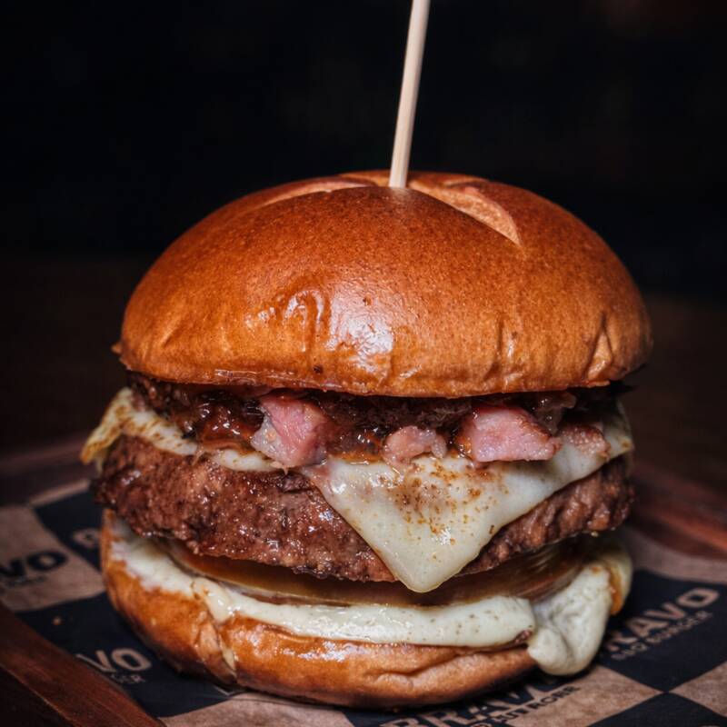 PÃO ESPECIAL SELADO NA MANTEIGA, BURGER BOVINO 160G, MUSSARELA DERRETIDA NO FOGO FORTE, BACON ARTESANAL, MAIONESE DEFUMADA DE ERVAS [FEITA NA CASA],TOMATE, GELEIA DE CEBOLA CARAMELIZADA [FEITA NA CASA]. "O primeiro favorito. Glorioso por natureza. O hambúrguer que atravessou o tempo e se tornou assinatura Bravo."