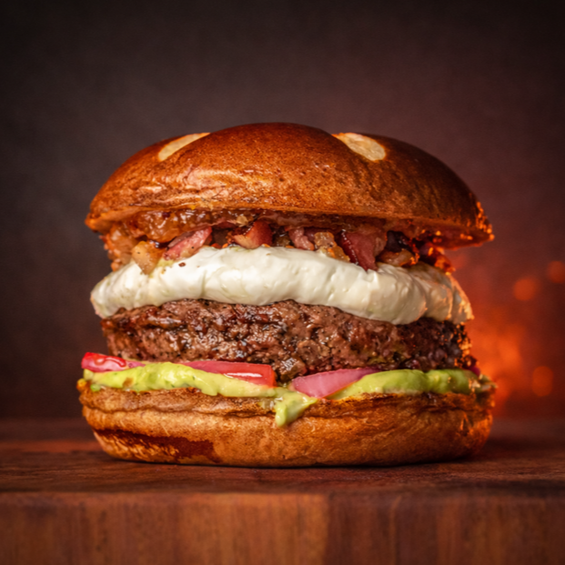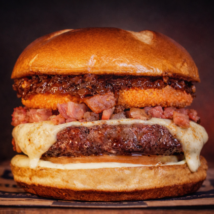 PÃO ESPECIAL SELADO NA MANTEIGA, BURGER BOVINO 160G, CREME CHEDDAR [FEITO NA CASA], TOMATE, BACON ARTESANAL, MAIONESE DEFUMADA DE ERVAS [FEITA NA CASA], GELEIA DE CEBOLA CARAMELIZADA. "Tem sabor que parece festa dentro da gente. Acontece toda vez que combinam bacon com cheddar e caramelizam cebola. Tudo dança!"