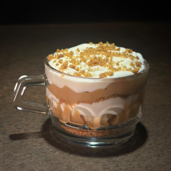 FAROFA DE BISCOITO BELGA COM ESPECIARIAS, DOCE DE LEITE , CREAM CHEESE AROMATIZADO COM BAUNILHA, BANANAS [TUDO EM CAMADAS DUPLAS]. "Abraço é o que é, envolve em camadas. Uma banoffe, mas feita como se tentássemos dizer “obrigada por estar aqui”. *Imagem ilustrativa. Enviamos em recipiente descartável.