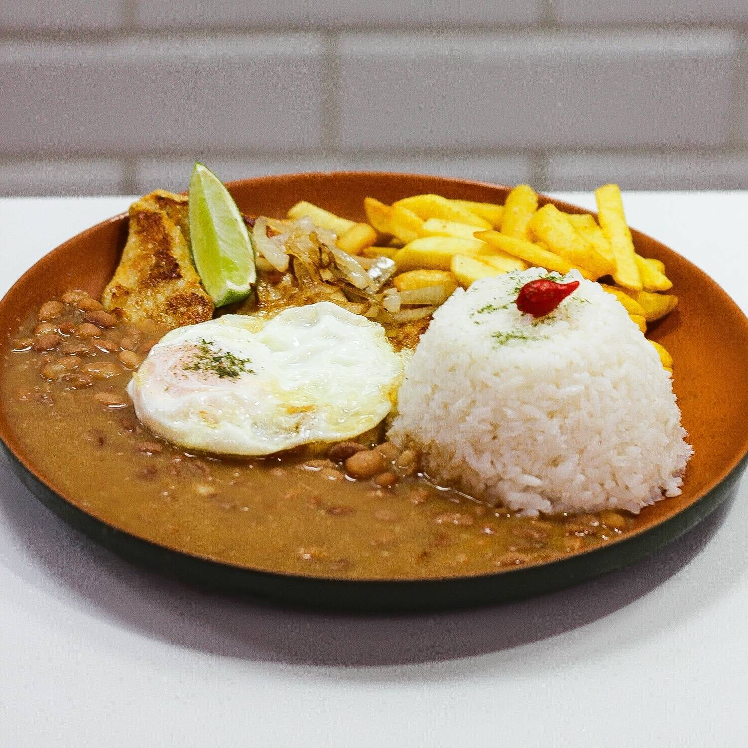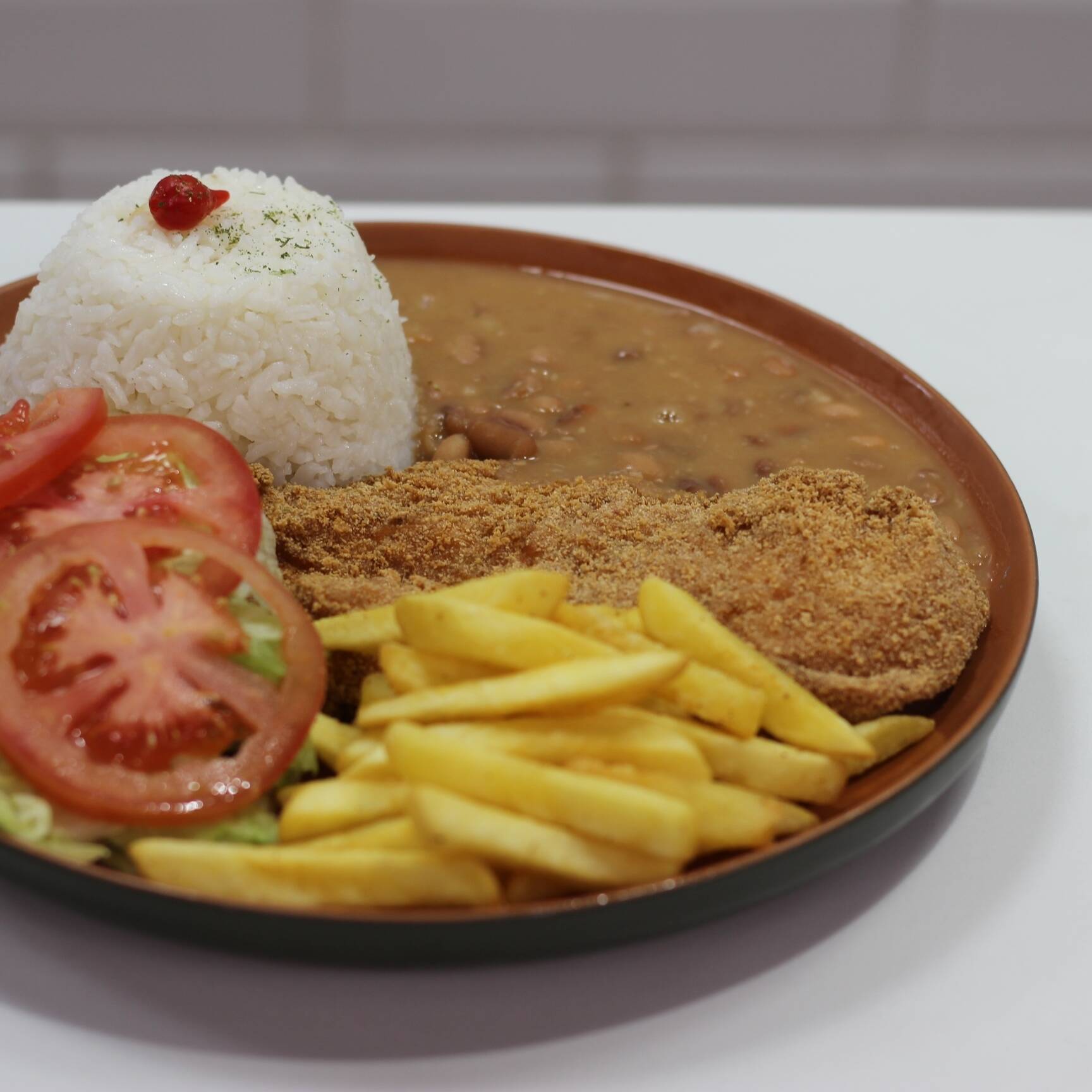 ARROZ, FEIJÃO DE CALDO, FILÉ DE FRANGO SUCULENTO, FRITAS E OVO
