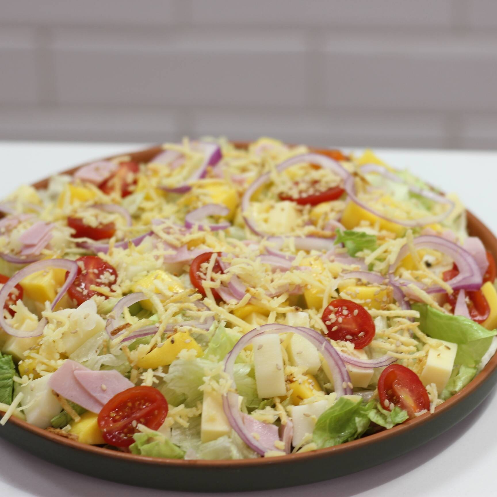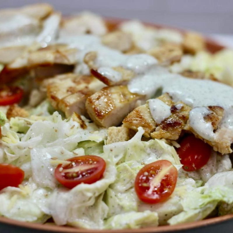 ALFACE PICADA, FRANGO EM TIRAS, GERGELIM, TOMATE CEREJA E CROUTONS