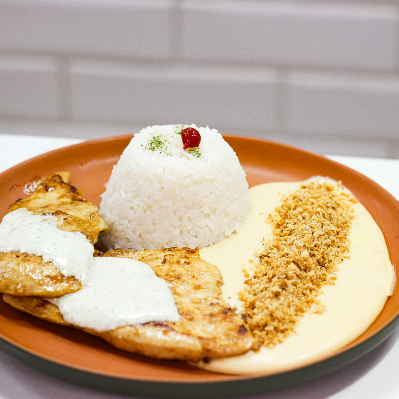 ARROZ BRANCO COM ALHO, MUSSELINE DE MANDIOCA, FILÉ DE FRANGO GRELHADO E CREME PARMESÃO