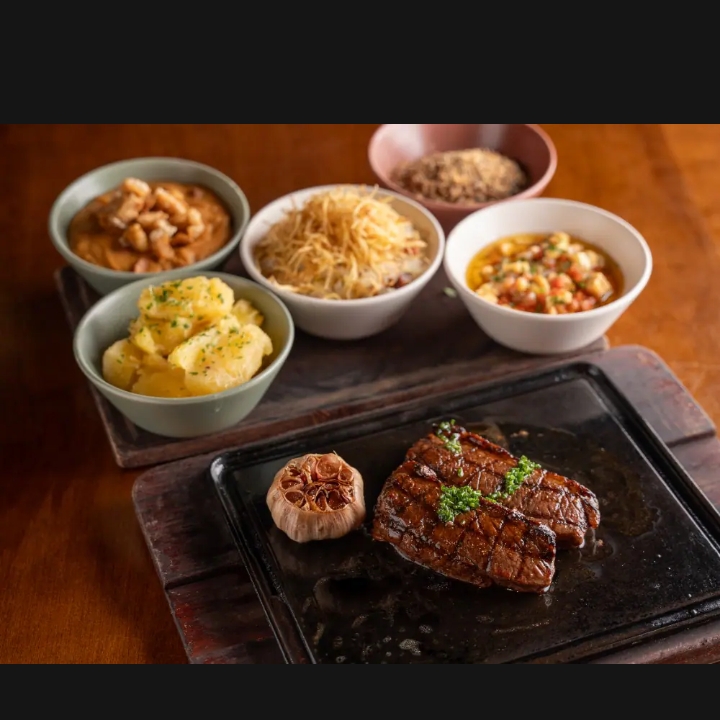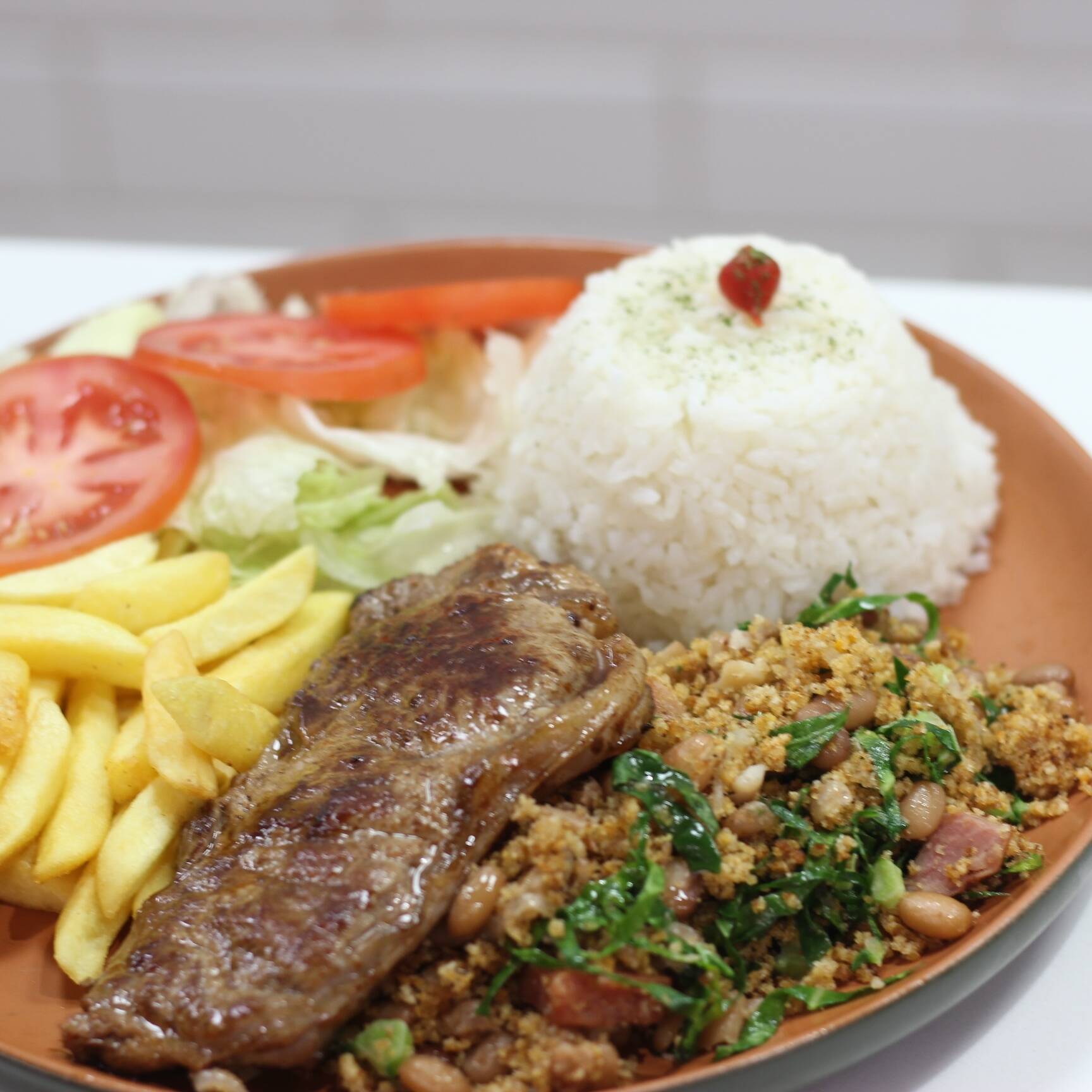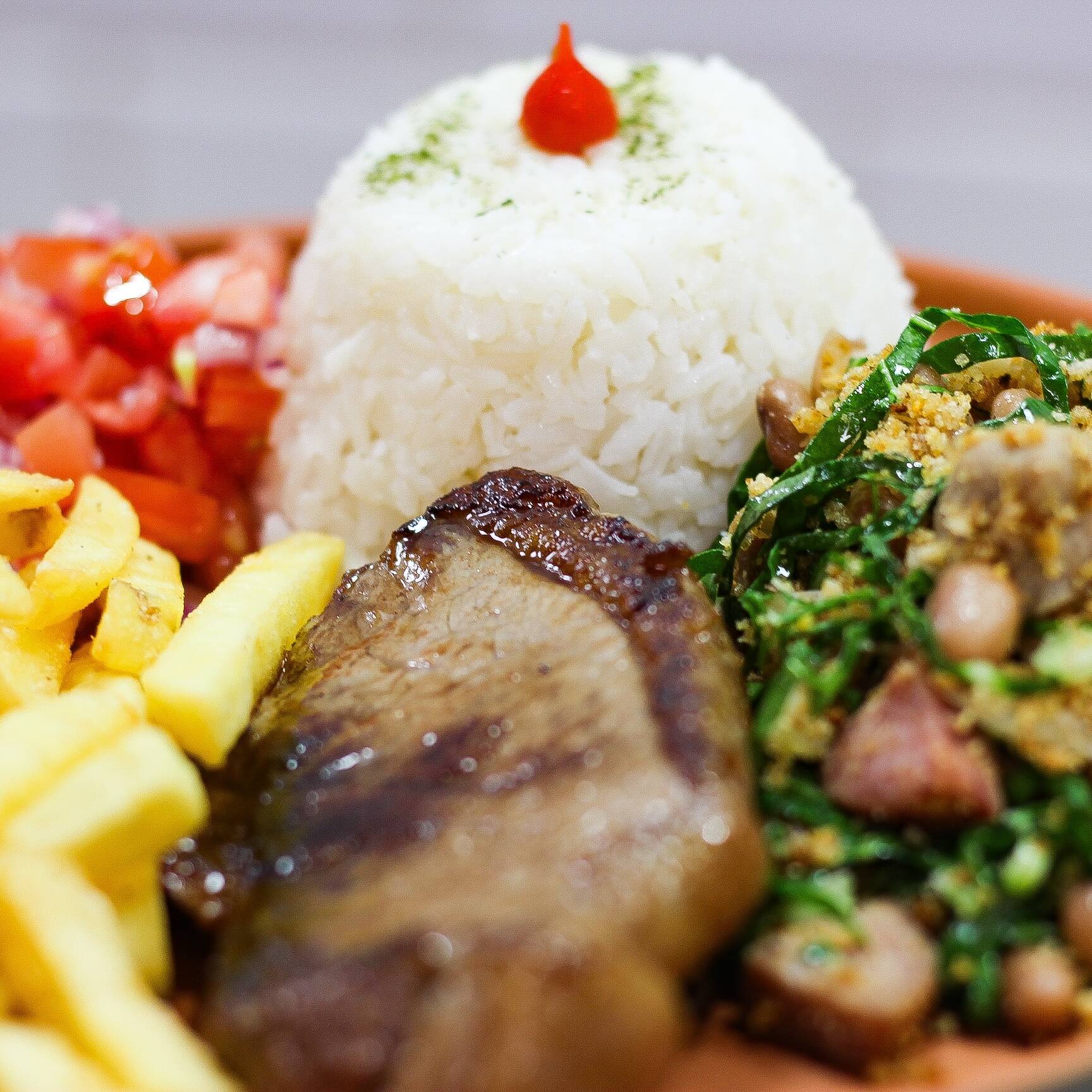 ARROZ , FEIJÃO TROPEIRO, FRITAS, VINAGRETE E SUCULENTA PICANHA 150G