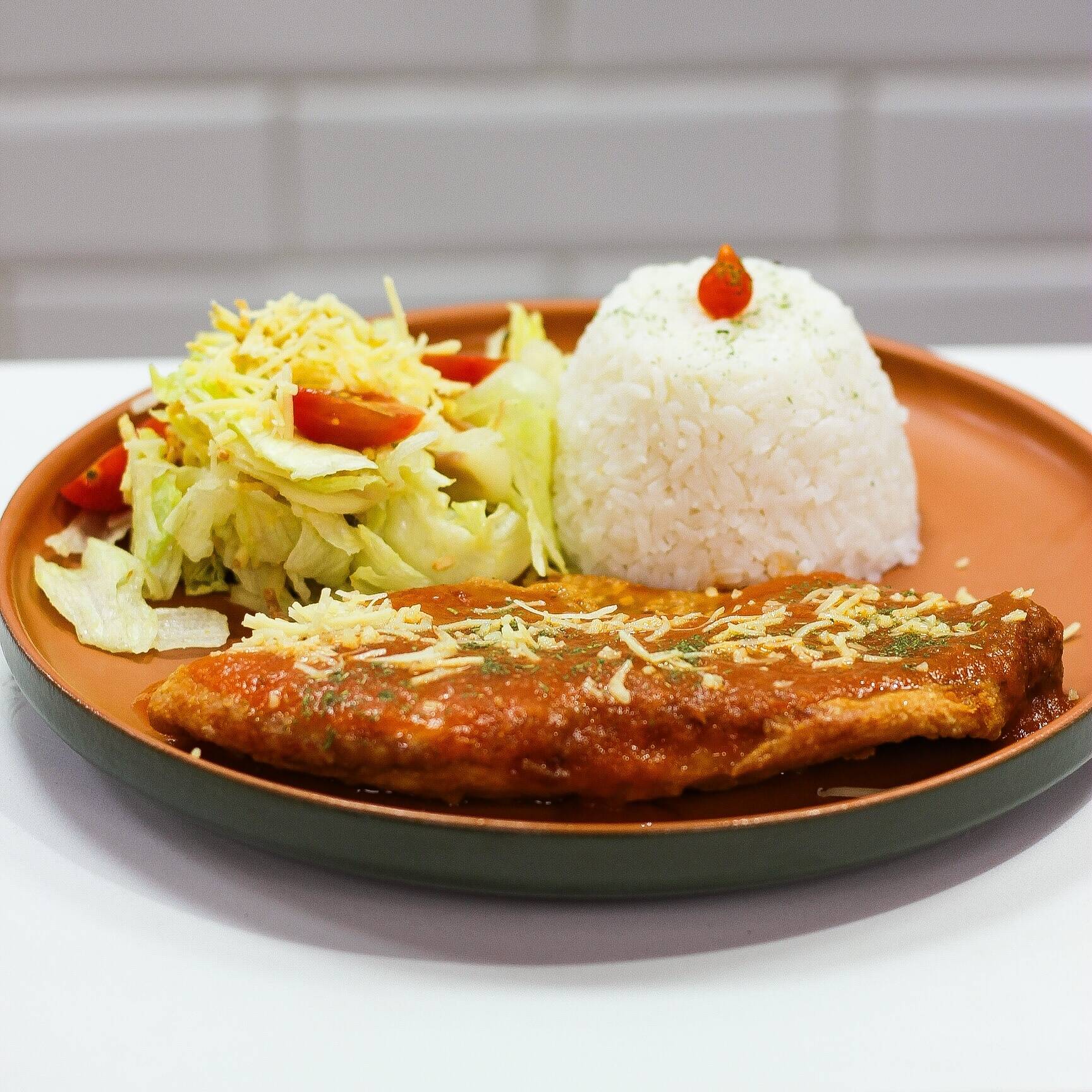 Parmegiana de frango crocante, molho artesanal e queijo gratinado. Acompanha arroz, fritas e 1 suco à sua escolha. Perfeito para quem quer comer bem e economizar!