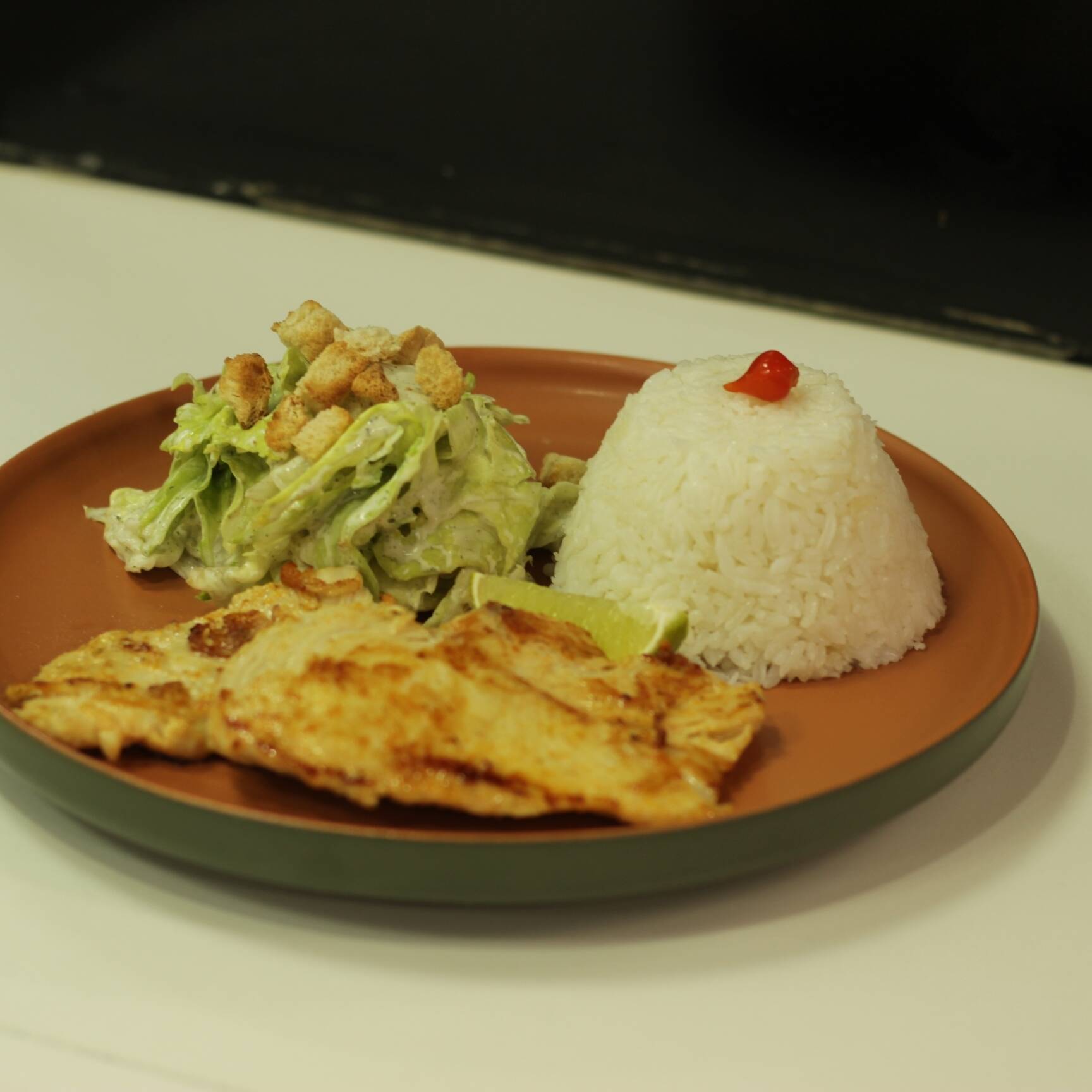 Filé de frango grelhado no ponto certo, servido com nossa refrescante Salada Caesar crocante e arroz soltinho. Leve e saboroso!