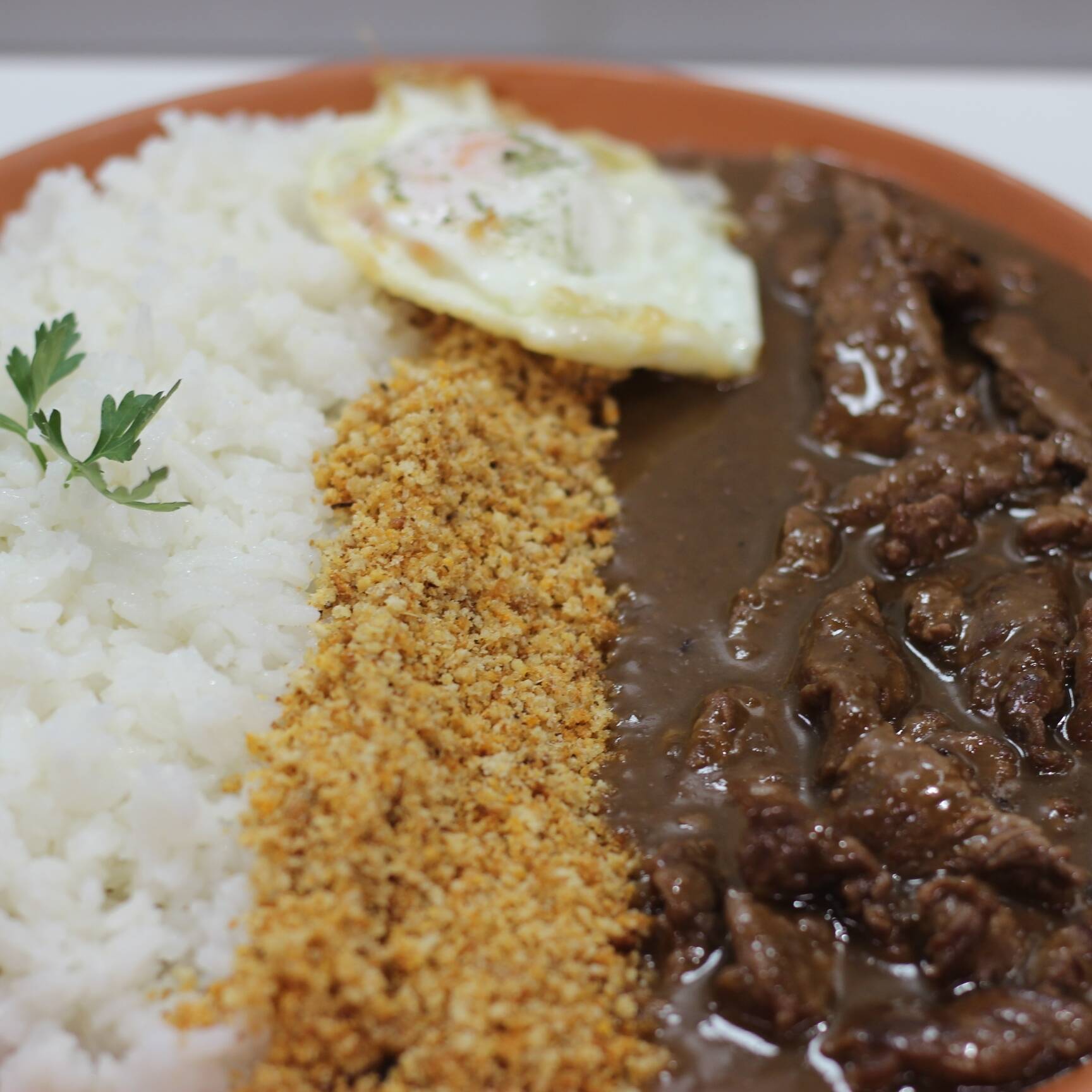 ARROZ, PICADINHO DE FILÉ, FAROFA DE CEBOLA ESPECIAL E OVO.