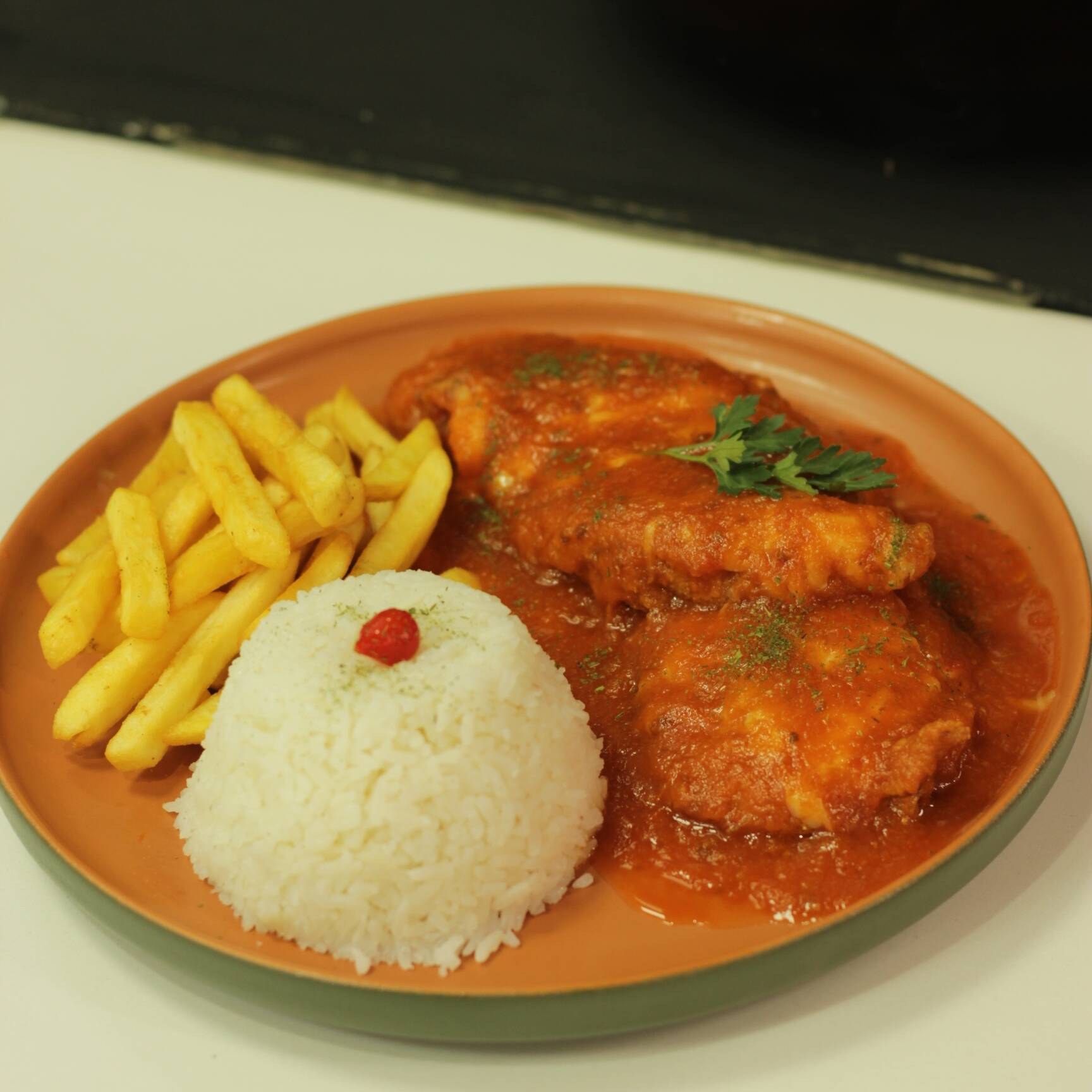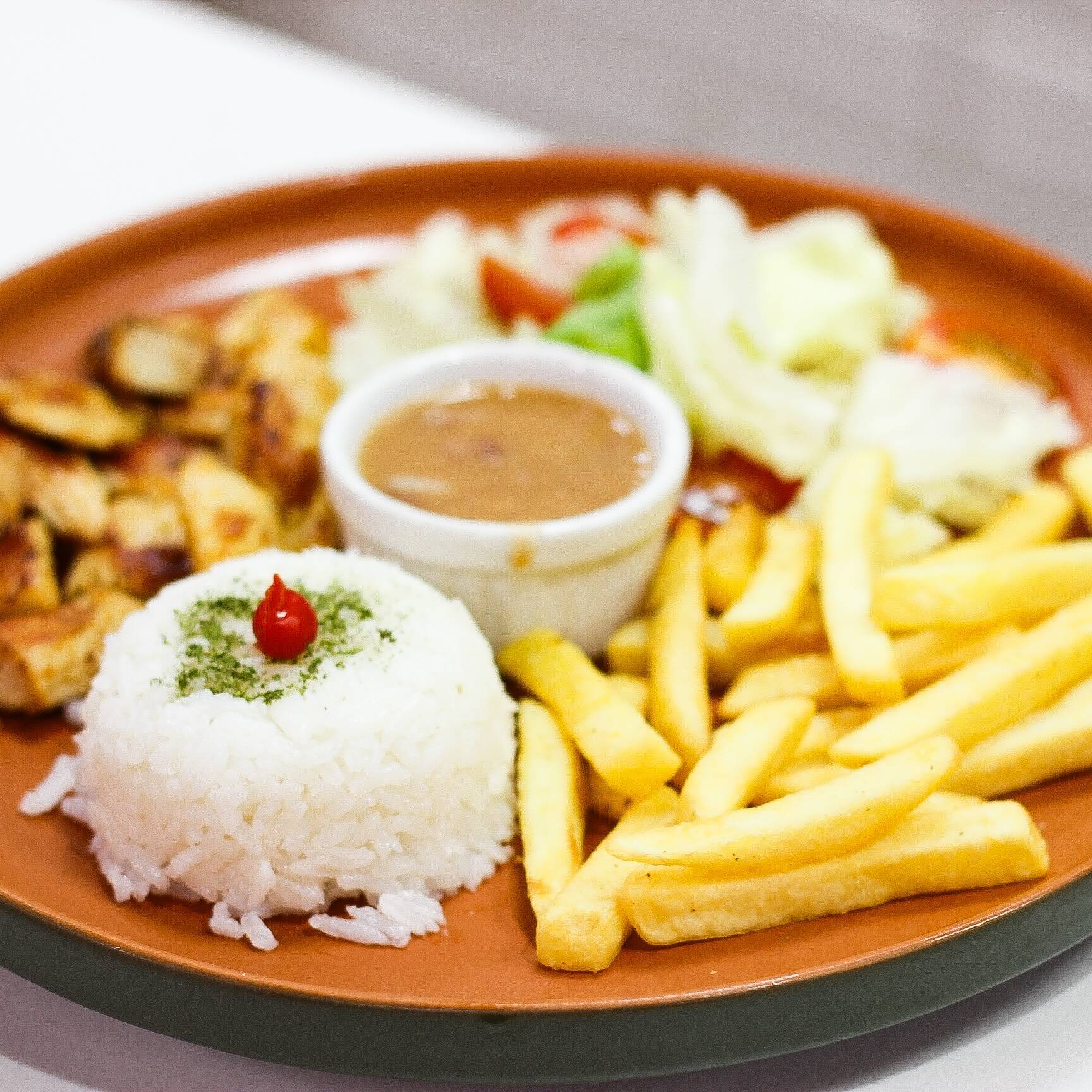 Deliciosos 450g de files de frango acompanhado de Arroz , fritas .