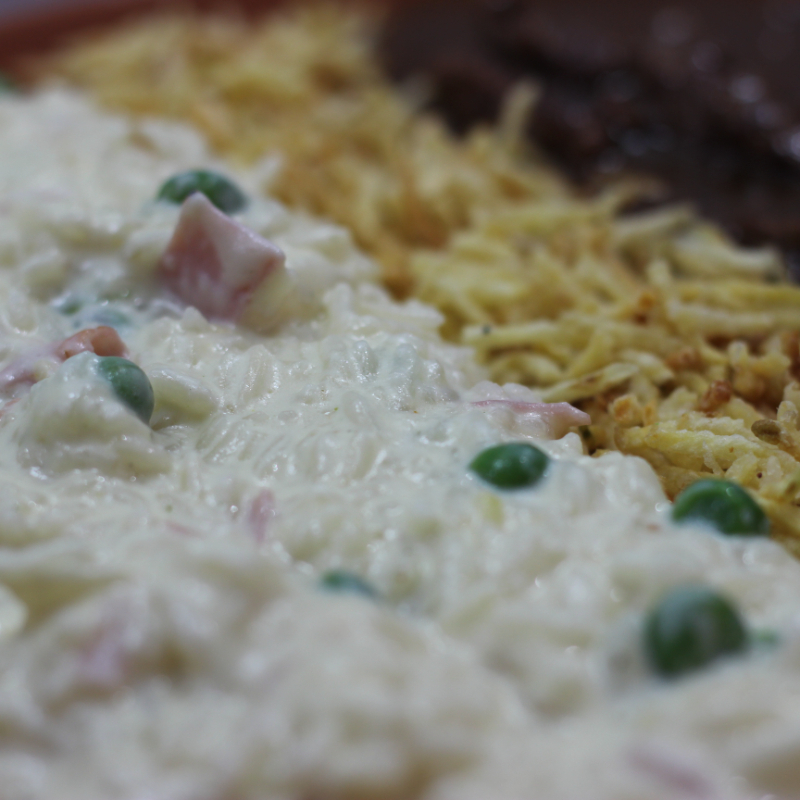 ARROZ CREMOSO COM ERVILHAS E PRESUNTO, BATATA PALHA, PICADINHO DE FILÉ.