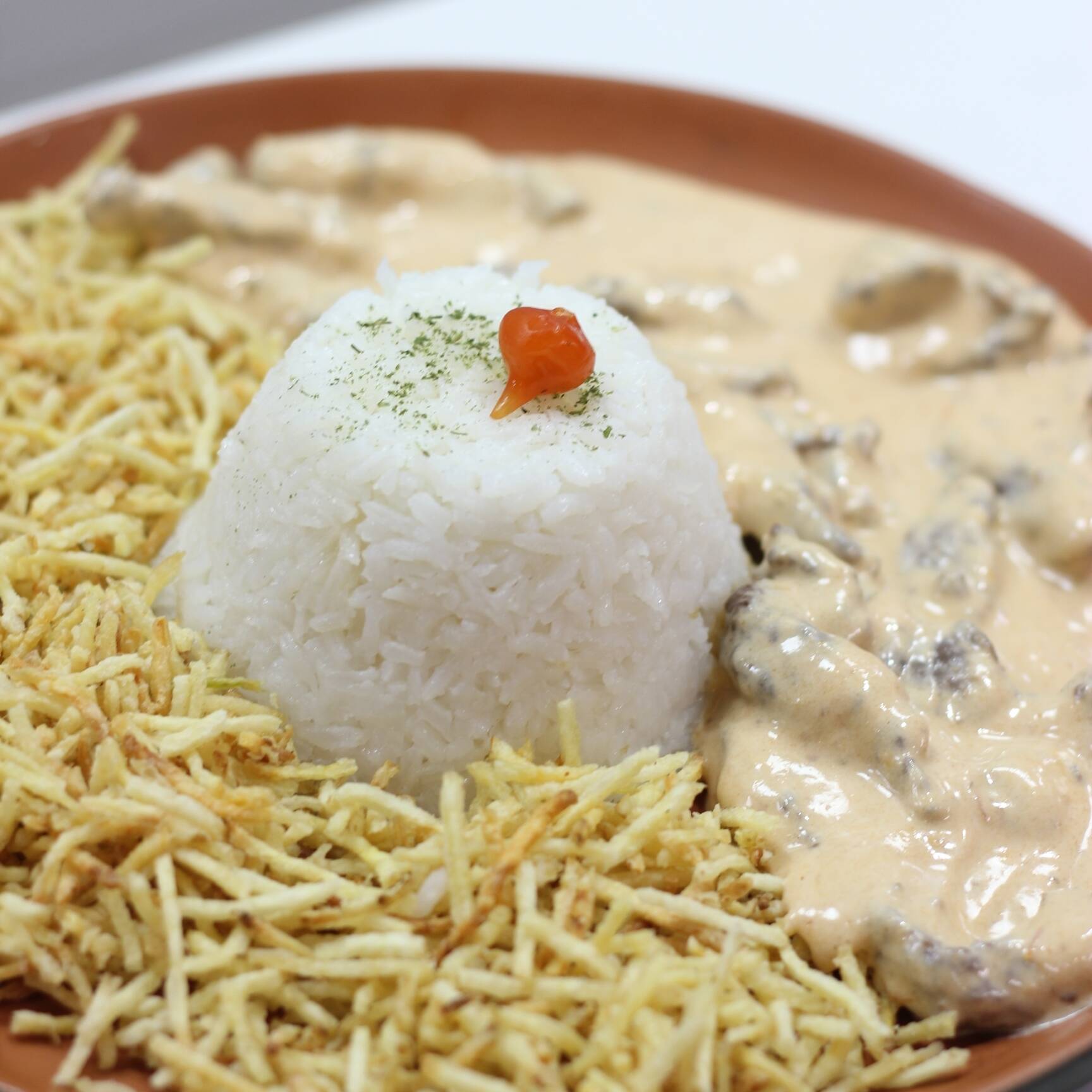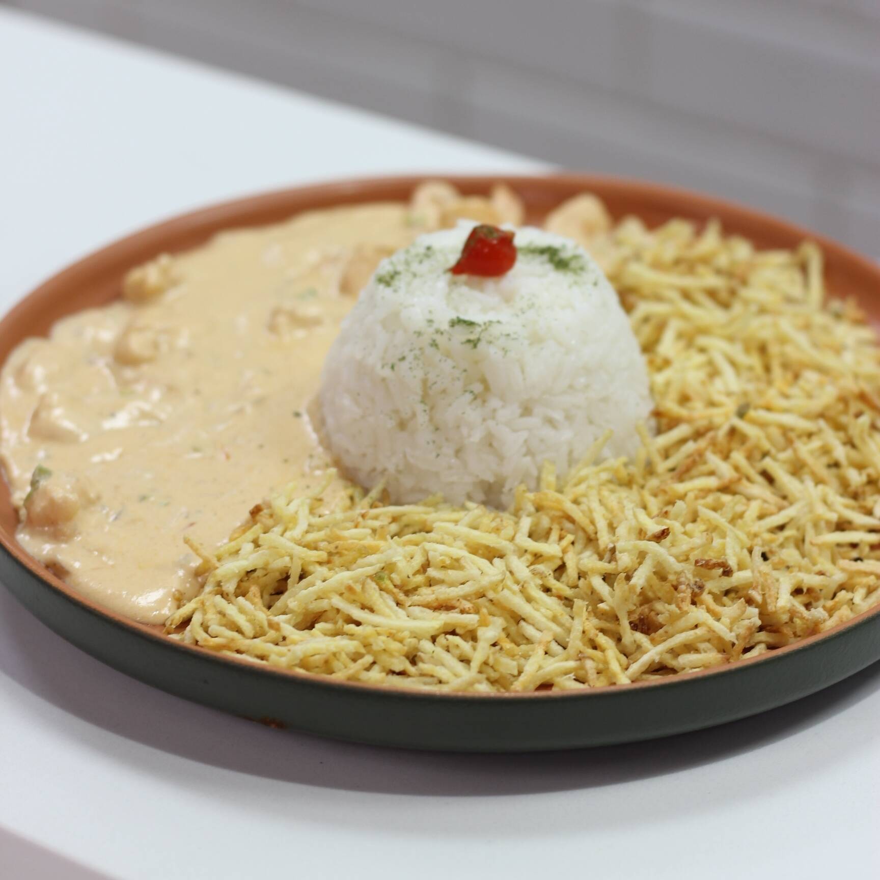 Arroz, Batata palha e um delicioso strogonoff fresco.