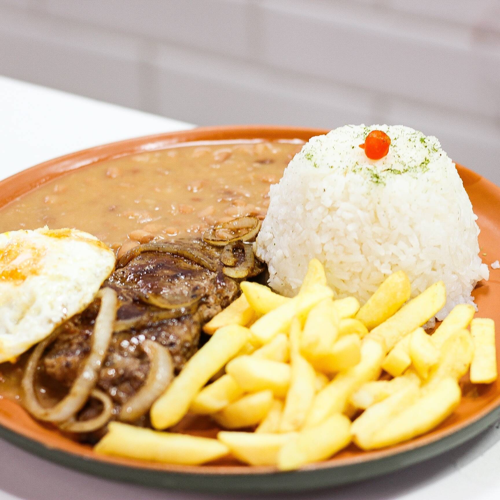 ARROZ, FEIJÃO DE CALD, FRITAS, OVO, SUCULENTO BIFE ACEBOLADO.