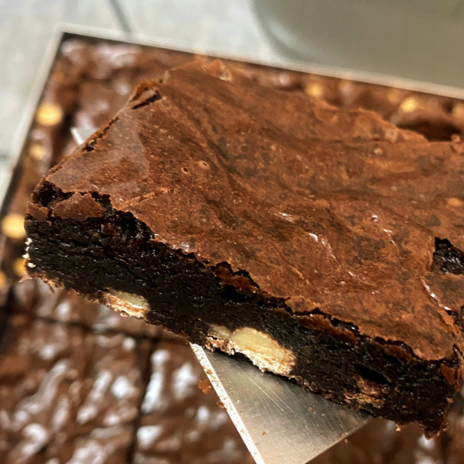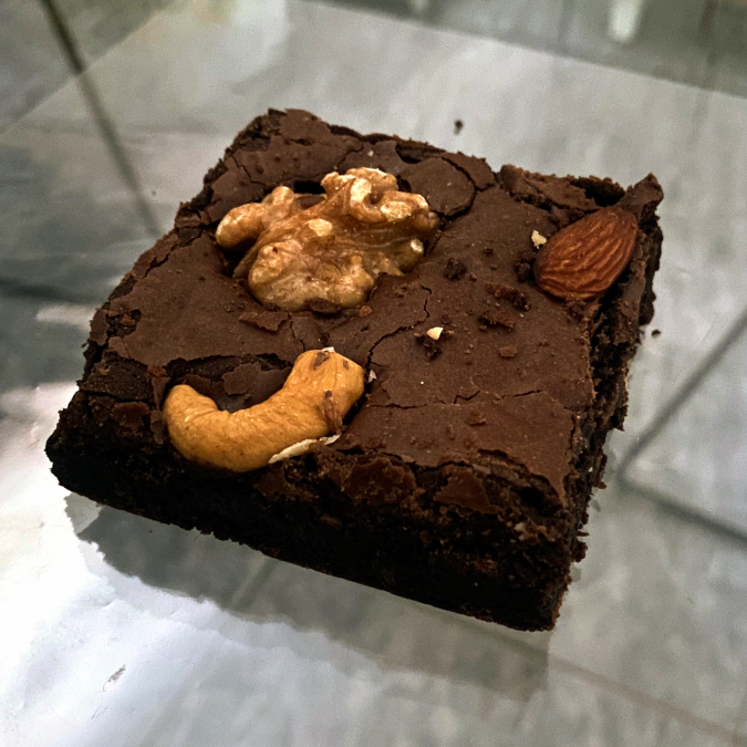 Brownnie 100% cacau com chocolate meio amargo nobre e castanhas. Denso, cremoso, alta confeitaria.