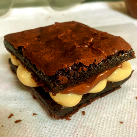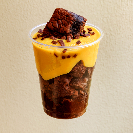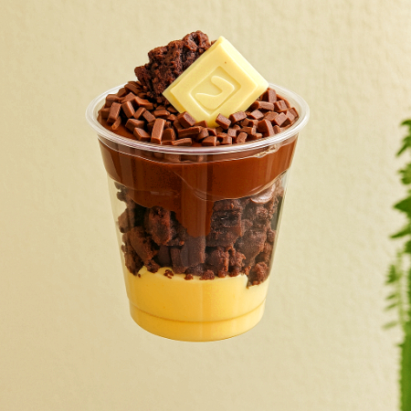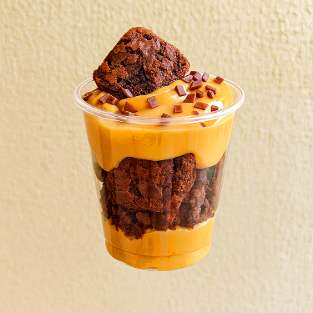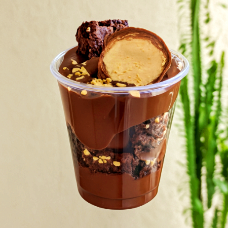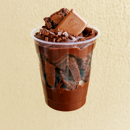Uma generosa camada de brigadeiro de doce de leite, mais pedaços do nosso famoso brownie, mais uma camada de brigadeiro de doce de leite, finalizado com brownie e granulé.