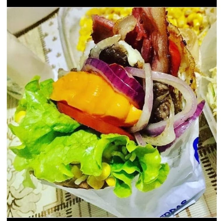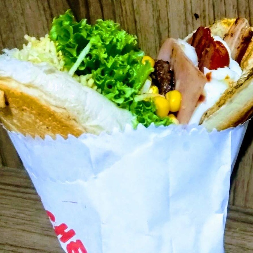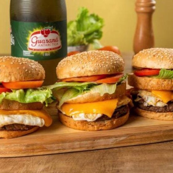 pão gourmet ,alface , tomate, hamburguer , cheddar, bacon, ovo, salsicha, cebola roxa.
