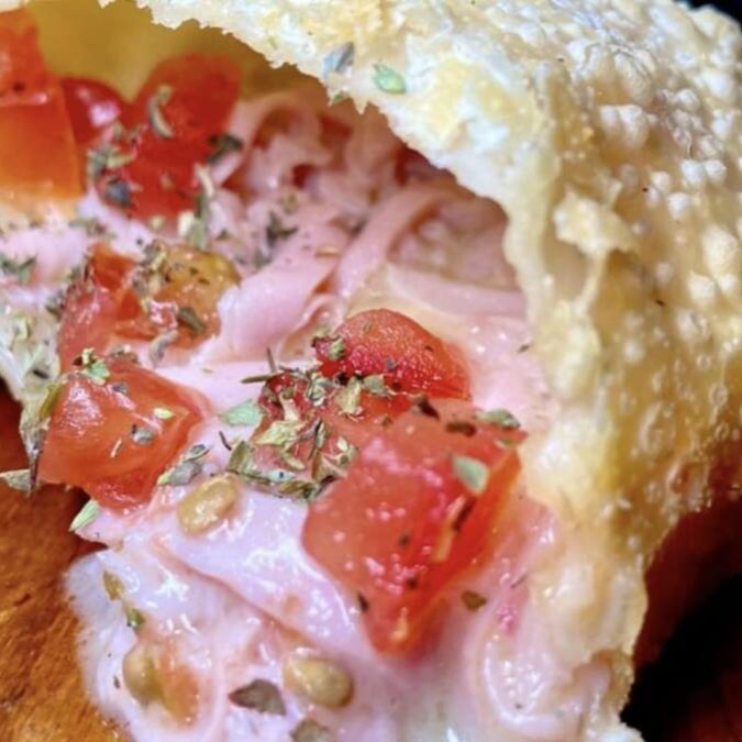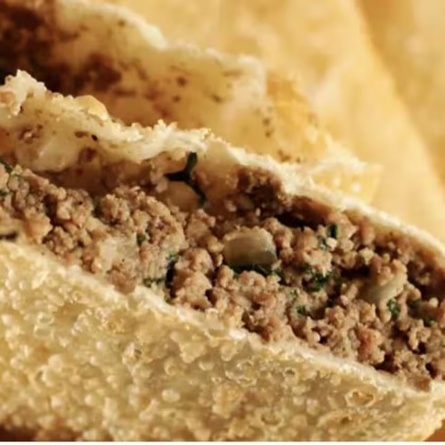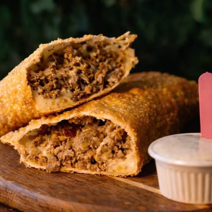 Pastel recheado com carne suculenta e queijo minas fresquinho, crocante por fora e cremoso por dentro. Uma combinação irresistível que conquista em cada mordida!